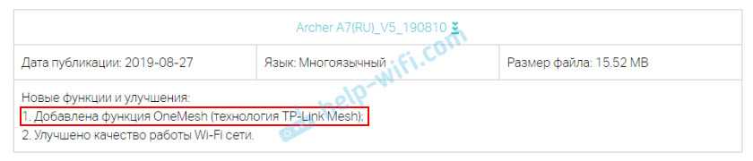 Поддержка OneMesh добавляется в последних прошивках. Например, вот последняя прошивка на сайте TP-Link для Archer A7 (V5.0):