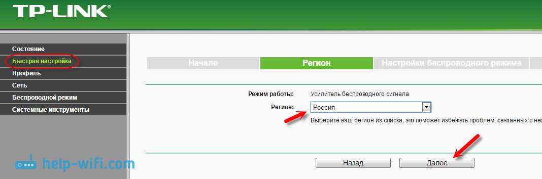 Есть такие маршрутизаторы, на которых нет кнопки WPS. В таких случаях, ретранслятор можно настроить вручную, лучше всего через мастер быстрой настройки. В панели управления перейдите на вкладку «Быстрая настройка», и нажмите кнопку «Далее».