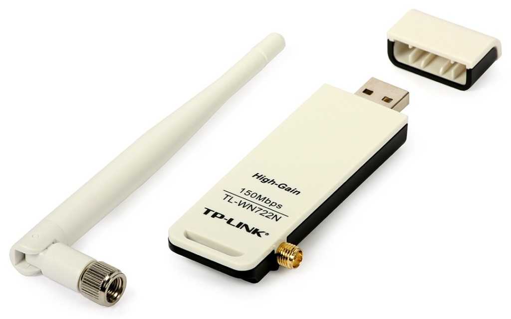 TP-Link TL-WN722N – более продвинутый девайс с наружной антенной, обеспечивающей коэффициент усиления 4 дБи. Устройство приема размещено на подвижной платформе, позволяющей выставлять направление в отношении источника сигнала. Модель может ловить сигнала даже в квартирах с ЖБ-стенами с минимальными потерями.