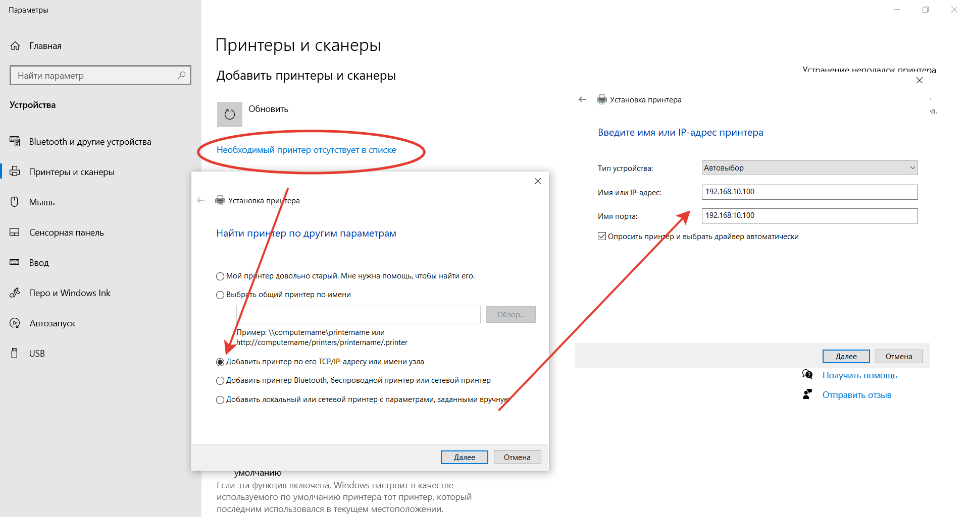 - Выбрать пункт «Необходимый принтер отсутствует в списке».