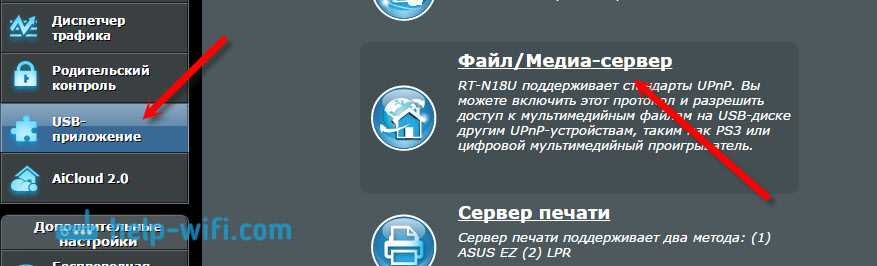 Для этого первым делом нужно зайти в настройки маршрутизатора по адресу 192.168.1.1 (если возникнут проблемы, изучите статью: “как зайти на роутер Asus” и общую статью с исправлением ошибок: “192.168.1.1“, а затем открыть USB-приложение – Файл/Медиа-сервер.