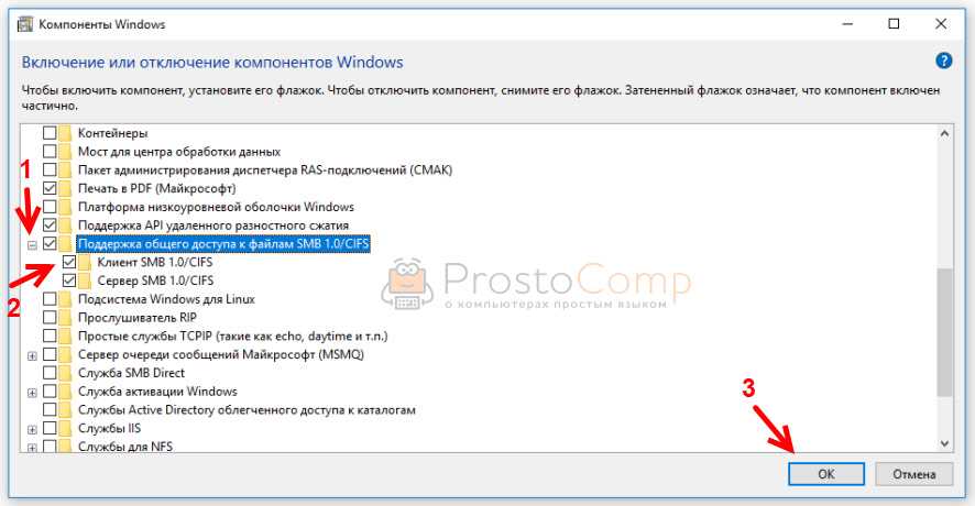 Открываем пункт «Поддержка общего доступа к файлам SMB 1.0/CIFS». Нужно поставить галочку возле «Клиент SMB 1.0/CIFS» и нажать «Ok».