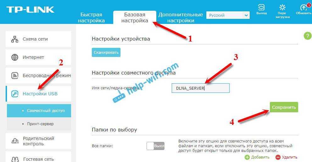 В новой версии web-интерфейса от TP-LINK, нужно открыть раздел «Базовая настройка», затем «Настройка USB» – «Совместный доступ», указать «имя сети/медиа-сервера», и нажать кнопку «Сохранить». И общий доступ, и DLNA-сервер будет запущен. Можно так же указать папки, который нужно расшарить на телевизор. Но, это уже по желанию.