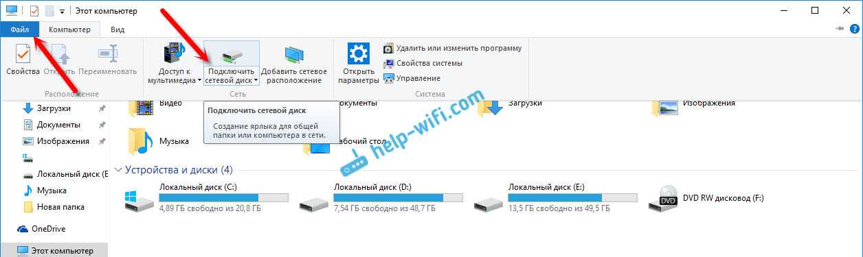 Открываем «Этот компьютер», нажимаем на вкладку «Файл», и выбираем «Подключить сетевой диск».