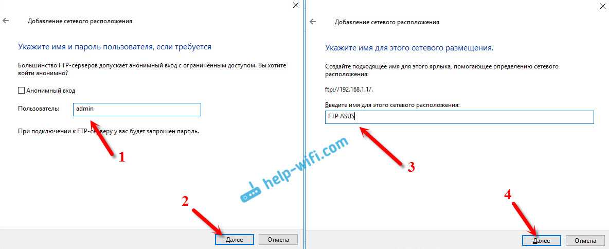 В следующем поле вводим имя пользователя, под которым будем заходить на FTP сервер. Я его не менял, поэтому, у меня admin. Нажимаем «Далее». И еще одно поле, которое нужно заполнить – имя для нашей папки. Я написал просто «FTP ASUS». Вы можете задать любое название.