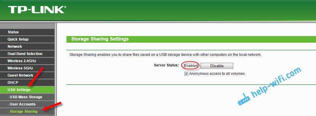 Все, сервер запущен. Проверяем, включен ли общий доступ к накопителю, что бы его могли видеть компьютеры и смартфоны. Для этого, перейдите на вкладку «Storage Sharing» (Совместный доступ) . Он должен быть запущен (в статусе Enabled) .