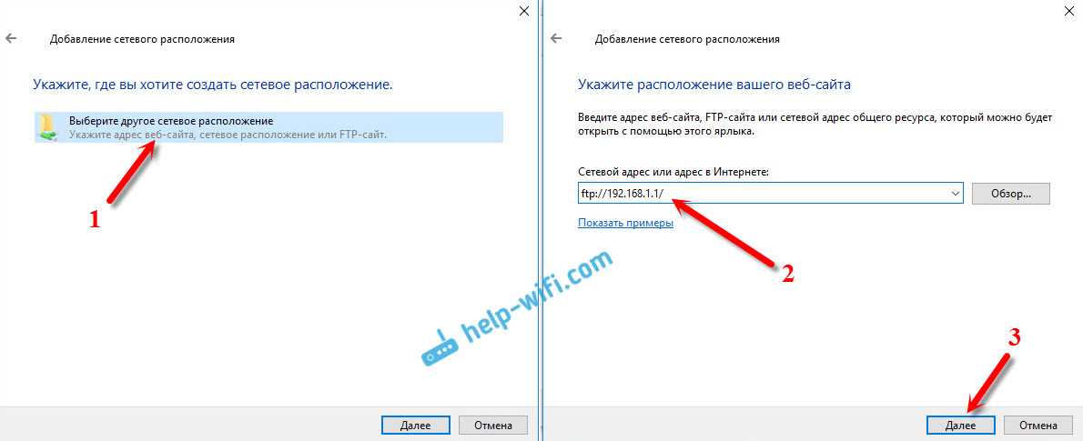 Кликаем два раза на пункт «Выберите другое сетевое расположение». Вводим в поле адрес нашего FTP сервера (скорее всего это ftp://192.168.1.1/)