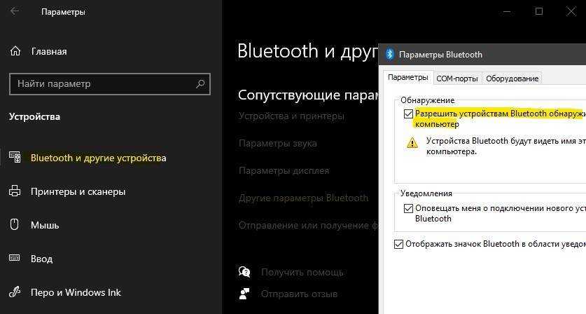 Откройте “Параметры” > “Устройства” > “Bluetooth и другие устройства” > справа найдите “Другие параметры Bluetooth“. В новом окне установите галочку “Разрешить устройствам Bluetooth обнаруживать этот ПК“.