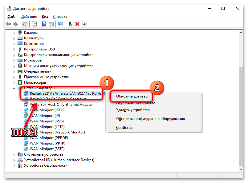 В первом случае необходимо открыть упомянутое системное приложение. Если в разделе «Сетевые адаптеры» около устройства беспроводной сети отображается значок в виде восклицательного знака, то ПО для оборудования требует обновления. Щелкните правой кнопкой мыши по его названию и выберите пункт «Обновить драйвер».