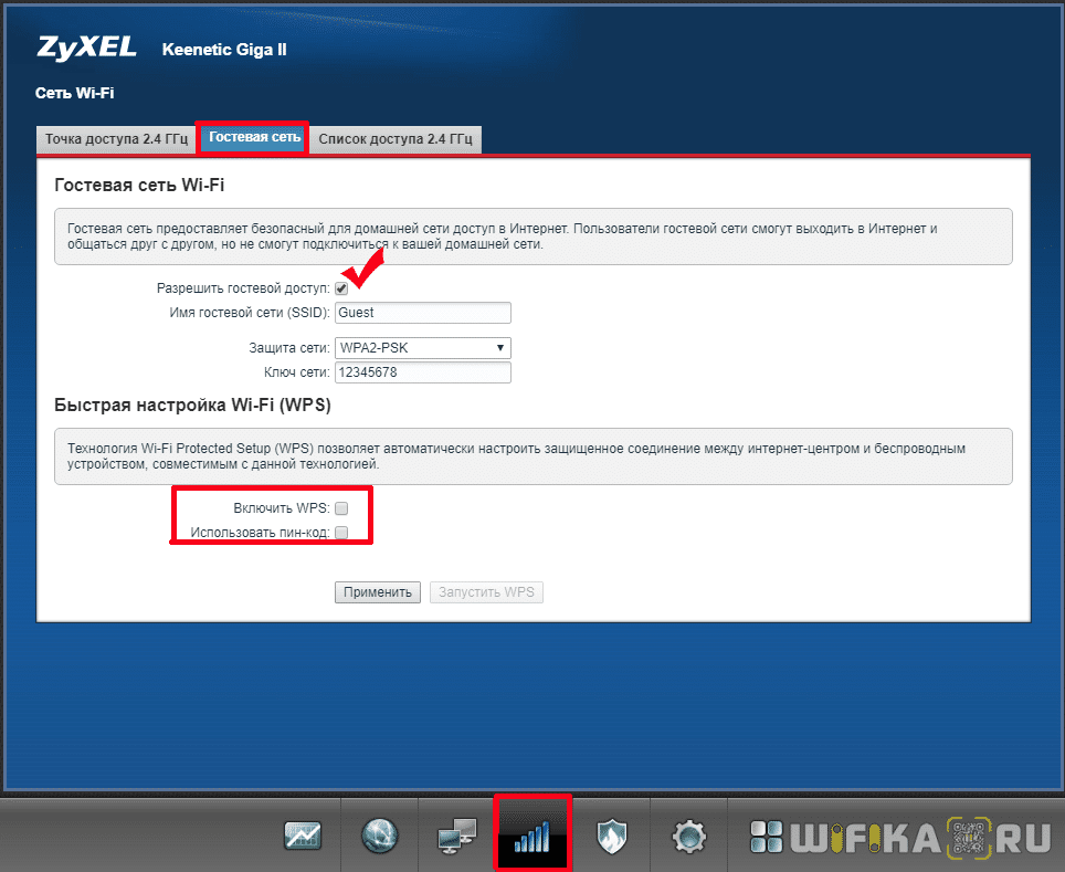 Для удобства и быстроты подключения новых гаджетов к гостевой сети на роутере Zyxel Keenetic есть возможность дополнительно активировать подключение по технологии WPS и с авторизацией при помощи пароля.