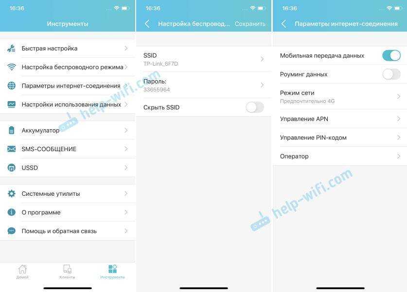 Все основные настройки находятся на вкладке “Инструменты”. Первый в списке мастер быстрой настройки. С его помощью можно изменить все основные настройки роутера (пошагово). В разделе “Настройка беспроводного режима” можно сменить имя сети и/или пароль, а так же сделать Wi-Fi сеть скрытой. А в разделе “Параметры интернет соединения” есть возможность отключить мобильную передачу данных, включить передачу данных в роуминге, выбрать режим сети, вручную изменить APN, выполнить необходимые операции с PIN-кодом и выбрать оператора (по умолчанию стоит автоматический выбор). Как я уже писал в начале статьи, TP-Link M7200 автоматически определяет оператора и настраивает подключение к интернету.