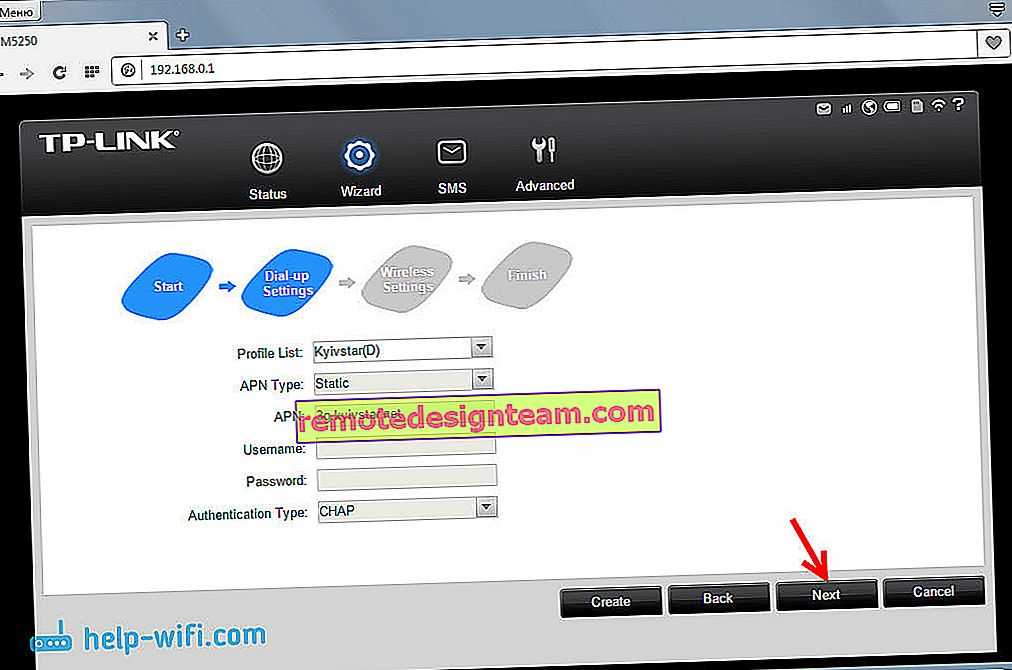 На наступній сторінці ми можемо задати параметри оператора. Але, я цього не робив. У мене там автоматично був визначений оператор Київстар, і прописані всі необхідні настройки. Тому, я просто натиснув на кнопку «Next».
