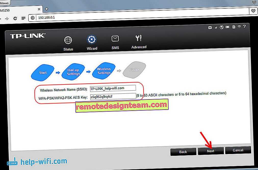 А ось наступна сторінка з настройками нам потрібна. На ній ми можемо змінити заводське назва Wi-Fi мережі і змінити заводський пароль. Вкажіть нове ім’я і пароль, і натисніть на кнопку «Next».