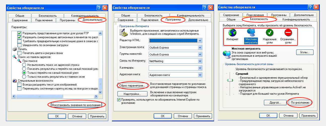 Этот вариант поможет вам в том случае, если что-то произошло с настройками Internet Explorer вследствие случайных изменений или вирусной активности, что очень запросто может быть на XP.