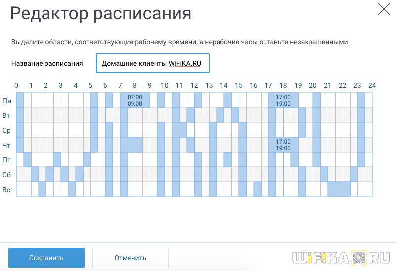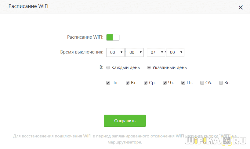 Активируем режим работы по расписанию и назначаем дни и время выключения WiFi.