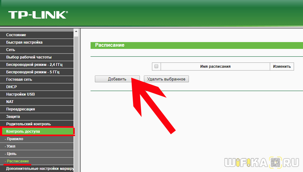 Для отключения wifi по расписанию заходим в меню «Контроль доступа — Расписание» и жмем на «Добавить»