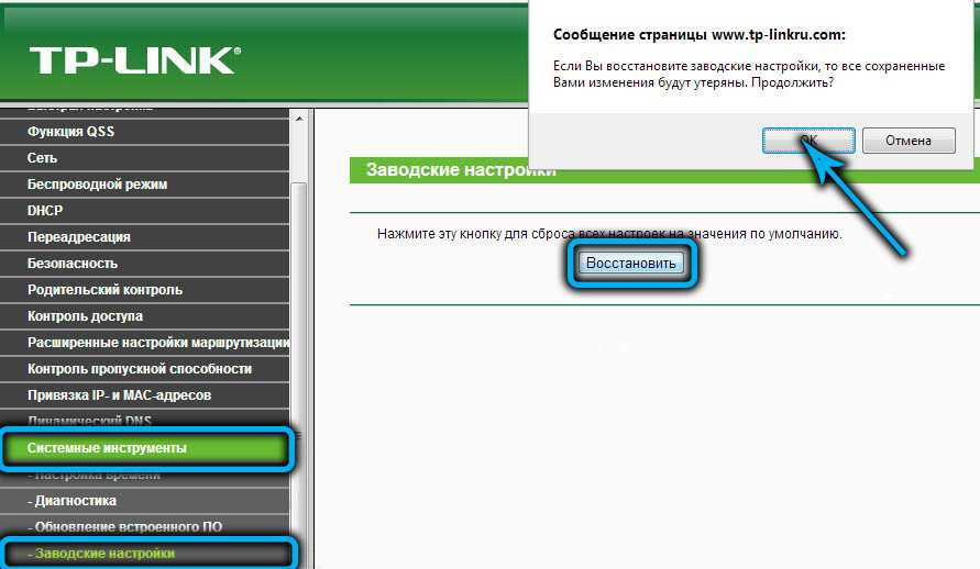 В остальных случаях сброс настроек до заводских можно осуществить через веб-интерфейс, выбрав пункт меню «Системные инструменты» и подпункт «Заводские настройки». Останется нажать кнопку «Восстановить» и дождаться перезагрузки роутера.