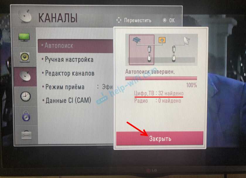 У меня телевизор LG нашел 32 канала. Нажав на кнопку «Закрыть» каналы будут сохранены. Если ваш телевизор не смог словить все каналы, то после настройки, или замены антенны можно заново запустить автоматический поиск.