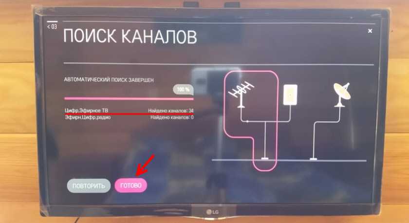 Если у вас были найдены не все каналы, то можете попробовать настроить антенну (поднять, повернуть в сторону вышки, проверить соединения) и запустить поиск еще раз, нажав кнопку «Повторить». Или нажать «Готово» и перейти к просмотру найденных каналов. Они будут сохранены.