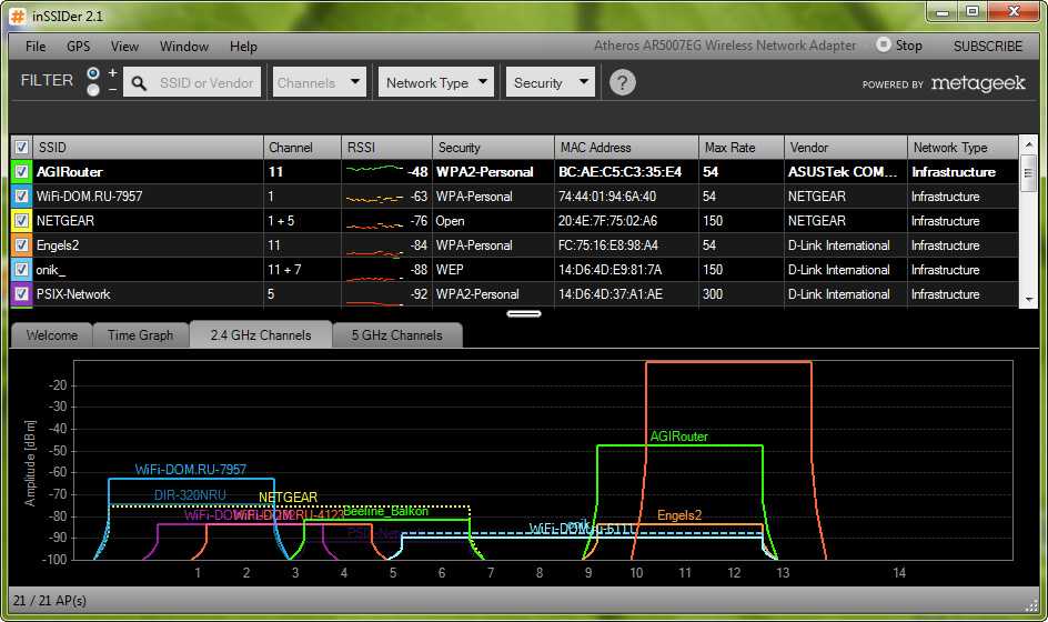 Надо скачать (или ее мобильное приложение), которая разыскивает все работающие Wi-Fi точки доступа в окрестности и предоставляет в удобном виде всю информацию о них: канал, на котором идет обмен данными, частоты работы, производитель оборудования, MAC-адреса всех ближайших точек доступа, SSiD, название беспроводной сети, максимально возможная скорость соединения, вид шифрования и многое другое. Все это выдается в виде наглядных графиков.