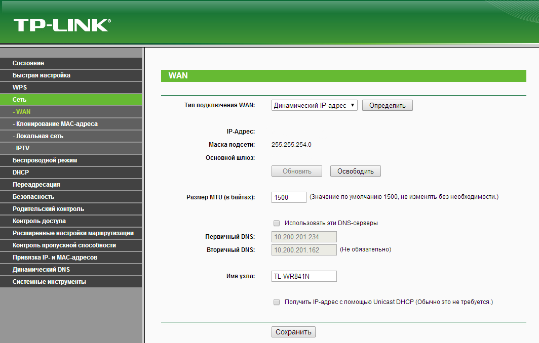 Далее необходимо будет сделать установку всех параметров подсоединения к сети интернет. Часто это делается в разделах «WAN» или «Интернет». Если после ввода параметров подключение не появилось, возможно, надо скопировать MAC-адрес ПК, с которого ведется настройка, в параметры роутера. На рисунке ниже можно увидеть, как настроить роутер от ТП-Линк. Если эти действия не помогли, то стоит позвонить провайдеру услуг и уточнить параметры подключения.