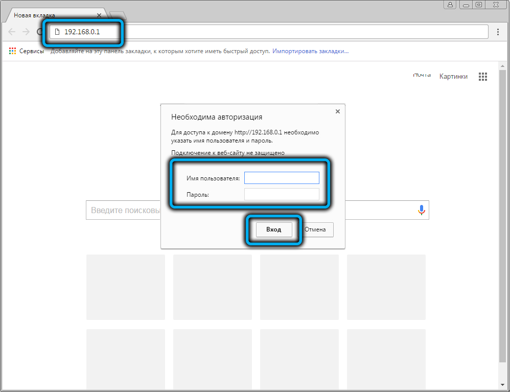 откройте браузер, введите в адресной строке 192.168.1.1 и нажмите на Enter/;