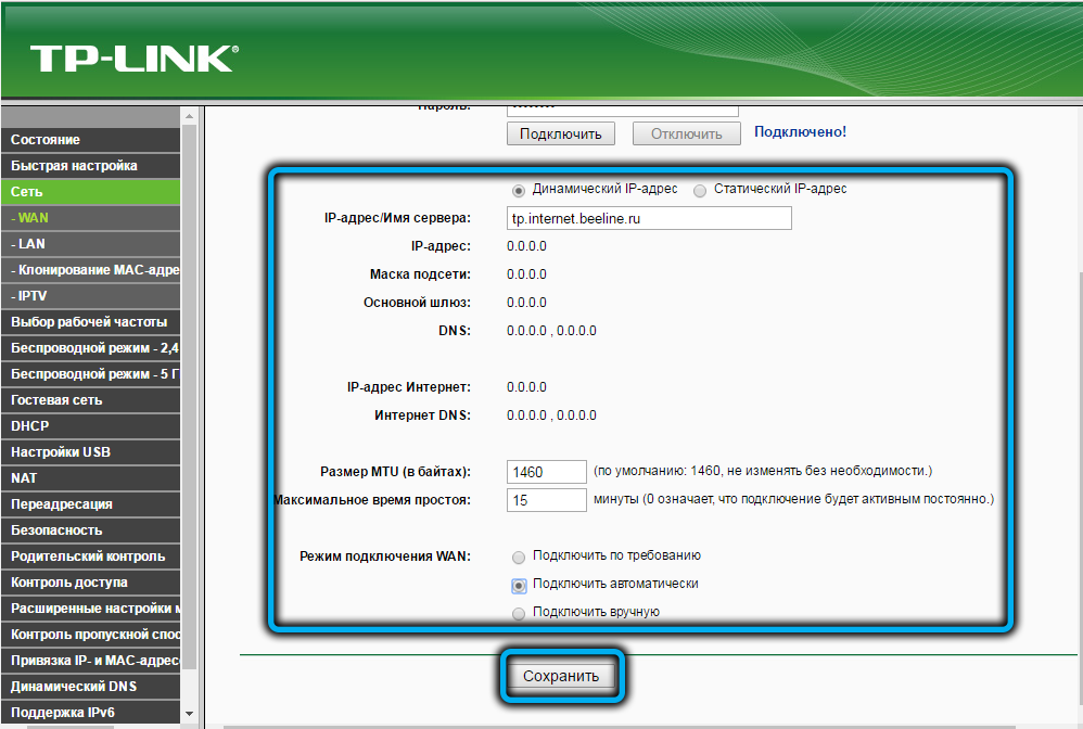 Итак, для большинства правильным следующим параметром будет «Динамический IP». После этого нужно ввести IP-адрес сервера вашего провайдера, установить для параметра «Режим подключения» значение «Подключать автоматически» (чтобы не вводить каждый раз логин и пароль) и кликнуть по кнопке «Сохранить».
