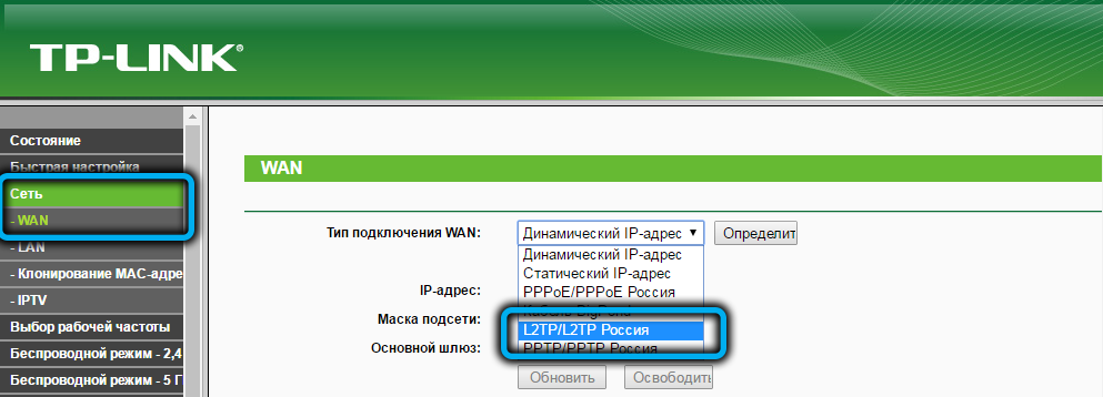 Поскольку расширенные настройки – более универсальный вариант, рассмотрим именно его. Итак, на главной странице административной панели выбираем вкладку «Сеть» и подпункт «WAN». Откроется страница, на которой нужно указать параметры соединения, первым будет «Тип подключения WAN», принимающий несколько значений. Рассмотрим, как настроить интернет на роутере TP-Link TL-WR940N в зависимости от типа подключения.