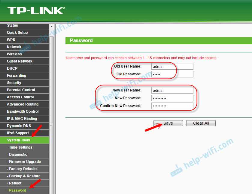 После обновления прошивки вторым делом рекомендуется сменить имя пользователя и пароль для входа в меню настроек. Для этого переходим в меню «System Tools», далее в подменю «Password». В верхней части вводим старые имя/пароль (admin/admin), в нижней части новое имя, пароль, и еще раз пароль для подтверждения. Жмем «Save», после чего снова появится начальное окно входа в меню настроек. Вводим новое имя и пароль.