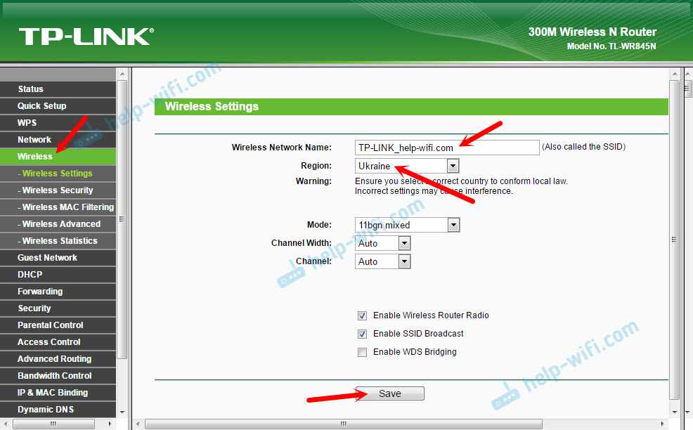 Открываем вкладку ‘Wireless’ (Беспроводной режим). Здесь, в поле ‘Wireless Network Name’ указываем название нашей Wi-Fi сети (английские буквы, цифры). И ниже, указываем свой регион. Больше ничего не меняем, нажимаем на кнопку ‘Save’ (если появится сообщение, жмем ok).