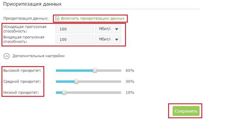 Нажмите Дополнительные настройки (Advanced) и перетащите отметку для выбора уровня приоритета полосы пропускания. Затем, нажмите Сохранить (Save).