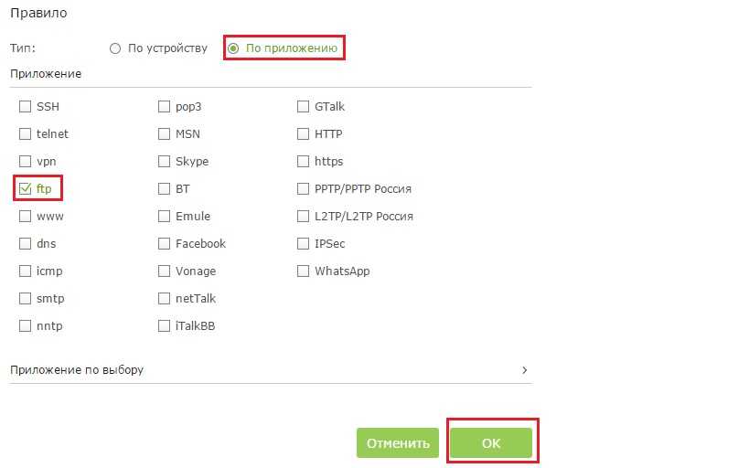 б. Выберите По приложению (By Application) и затем выберите ftp из списка и нажмите OK.