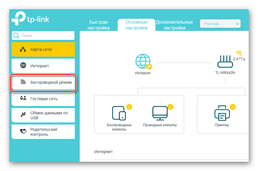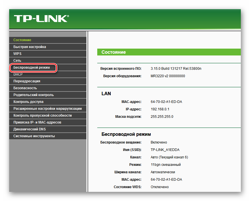 В открывшемся веб-клиенте роутера переходим на вкладку «Беспроводной режим». Здесь мы найдём все необходимые нам настройки.