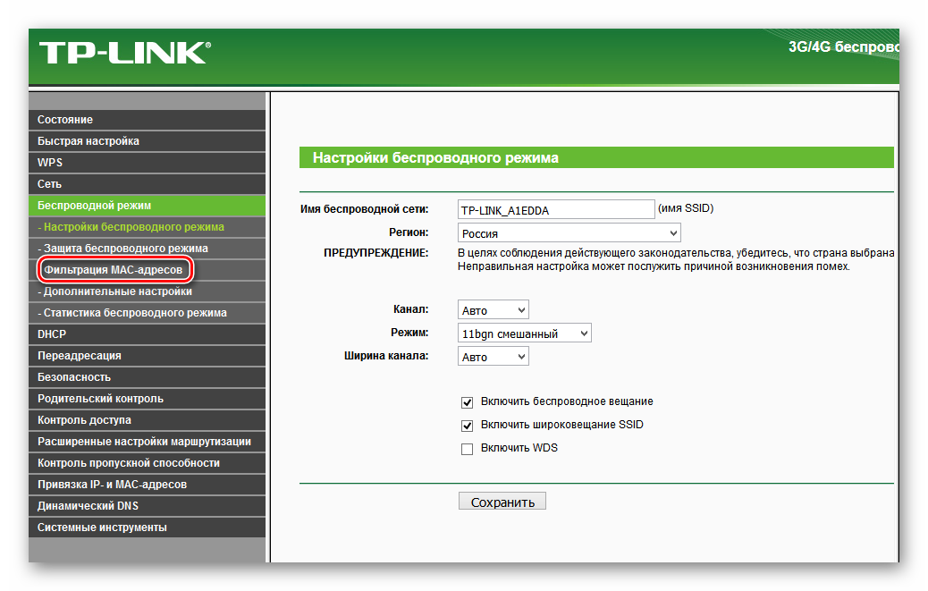В выпавшем подменю смело переходим на страницу «Фильтрация MAC-адресов». Все нужные нам настройки там.