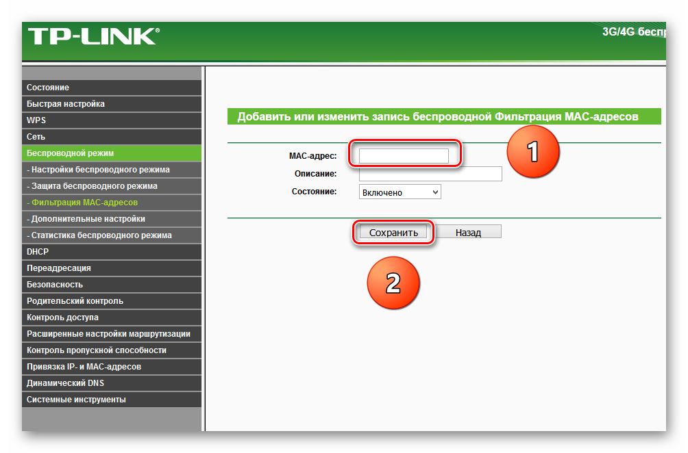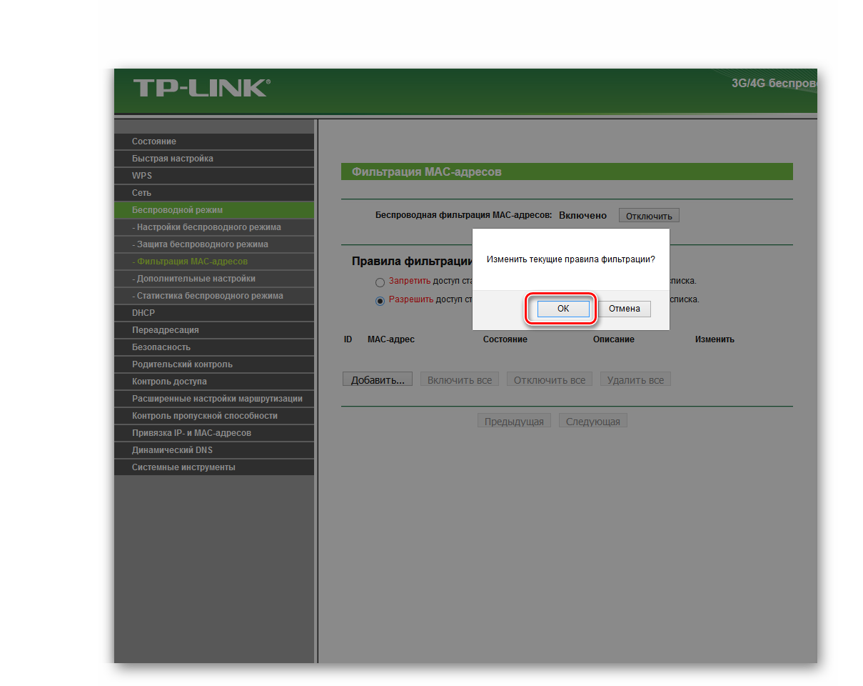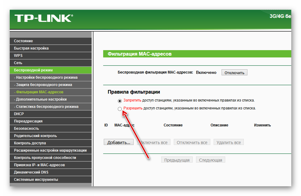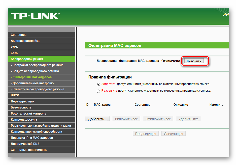 Теперь нужно задействовать сам сервис беспроводной фильтрации MAC-адресов на роутере.