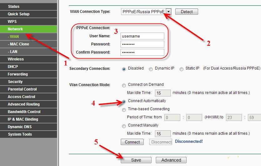 РРРоЕ нужен для работы с Дом.ру и оператором Ростелеком. Перейдите в «WAN» раздела «Сеть» и заполните поля таким образом: