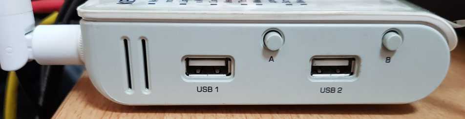 Выше на фотографии изображён роутер Zyxel Keenetic Giga. На его боковой панеле расположены два USB порта. Для безопасного извлечения рядом с каждым из портов есть соответствующие им кнопки A и B.