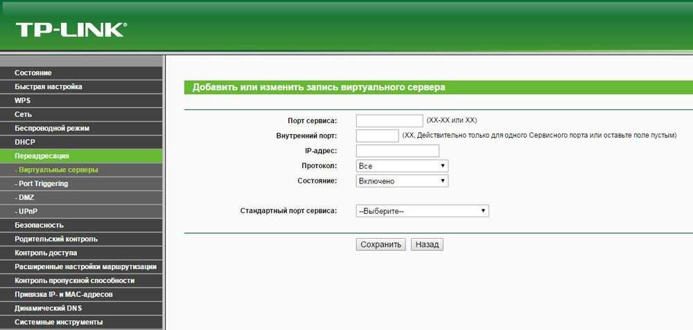 Пользователям TP-LINK для того чтобы открыть порт нужно открыть настройки роутера и перейти в раздел «Forwarding», а потом открыть подраздел «Virtual Servers». Виртуальный сервер — это одно из названий для данной функции, подобный термин используется на многих маршрутизаторах.