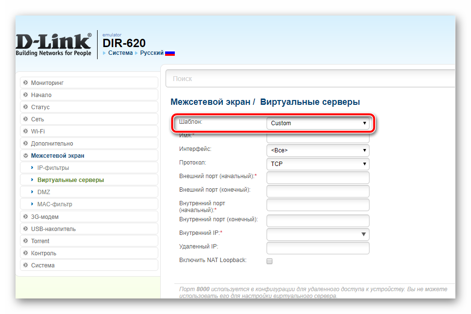 Вам доступен выбор одного из готовых шаблонов, они включают в себя сохраненную информацию о некоторых портах. Их задействовать в данном случае не нужно, поэтому оставьте значение «Custom».