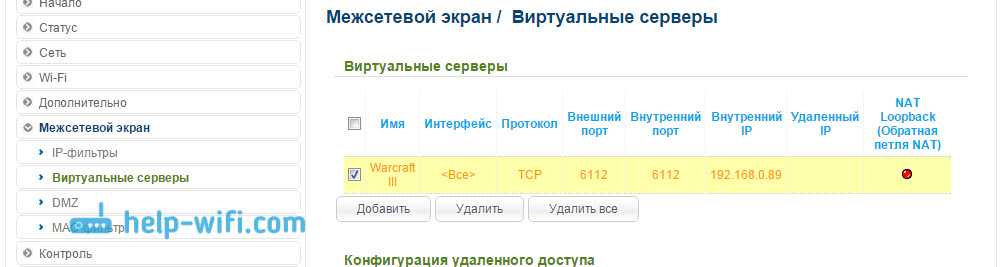 Вы увидите созданное правило, которое можно отредактировать (нажав на него) , или удалить. Можно создавать новые правила для проброса портов, точно таким же способом.