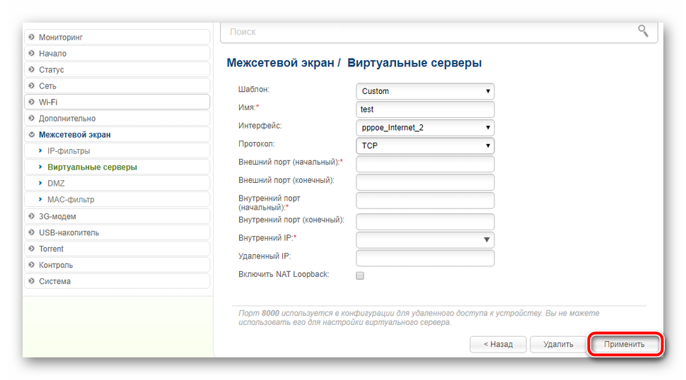 В настройках внутренней сети надо указать IP-адрес ПК или устройства в локальной сети, для которого делаем проброс. Ниже указываем порт, который хотим открыть. При необходимости можно указать диапазон портов. Для публичной сети в поле IP ничего указывать не надо, необходимо просто прописать тот же самый порт или диапазон, который хотим открыть. Нажимаем кнопку «Применить».