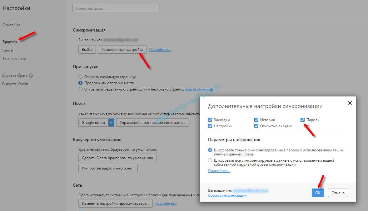 Включаем синхронизацию паролей. Это можно сделать в настройках. «Меню» – «Настройки». Нажимаем на кнопку «Расширенная настройка», выделяем «Пароли» и «Ok».