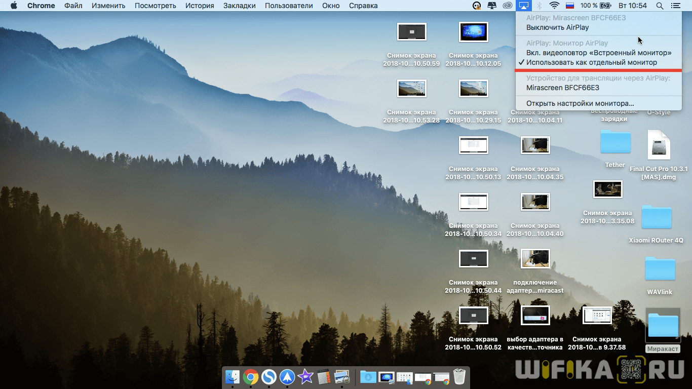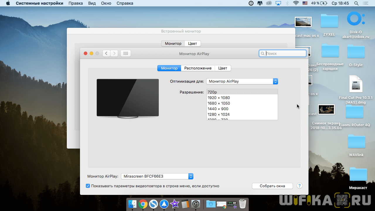 Но и это еще не все — если нажать на значок AirPlay еще раз, то увидим такую функцию, как «Использовать как отдельный монитор». Если ее активировать, то ТВ превратится во второй монитор — такое виртуальное расширение рабочего стола, на который можно перетянуть какое-нибудь окно одного из открытых приложений.