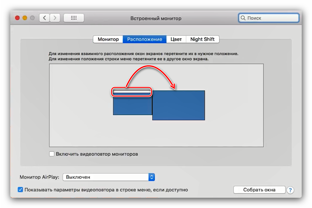 «Расширение» – телевизор используется просто как второй монитор: например, на встроенном экране МакБука можно открыть веб-браузер, а на телевизоре – видеоплеер или просмотрщик изображений. Эта опция активируется автоматически, если снять отметку с пункта «Включить видеоповтор…»;
