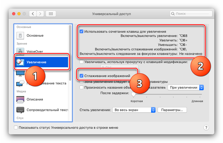 В меню слева кликните по варианту «Увеличение». Отметьте опции «Использовать сочетания клавиш для увеличения» и «Сглаживание изображений».