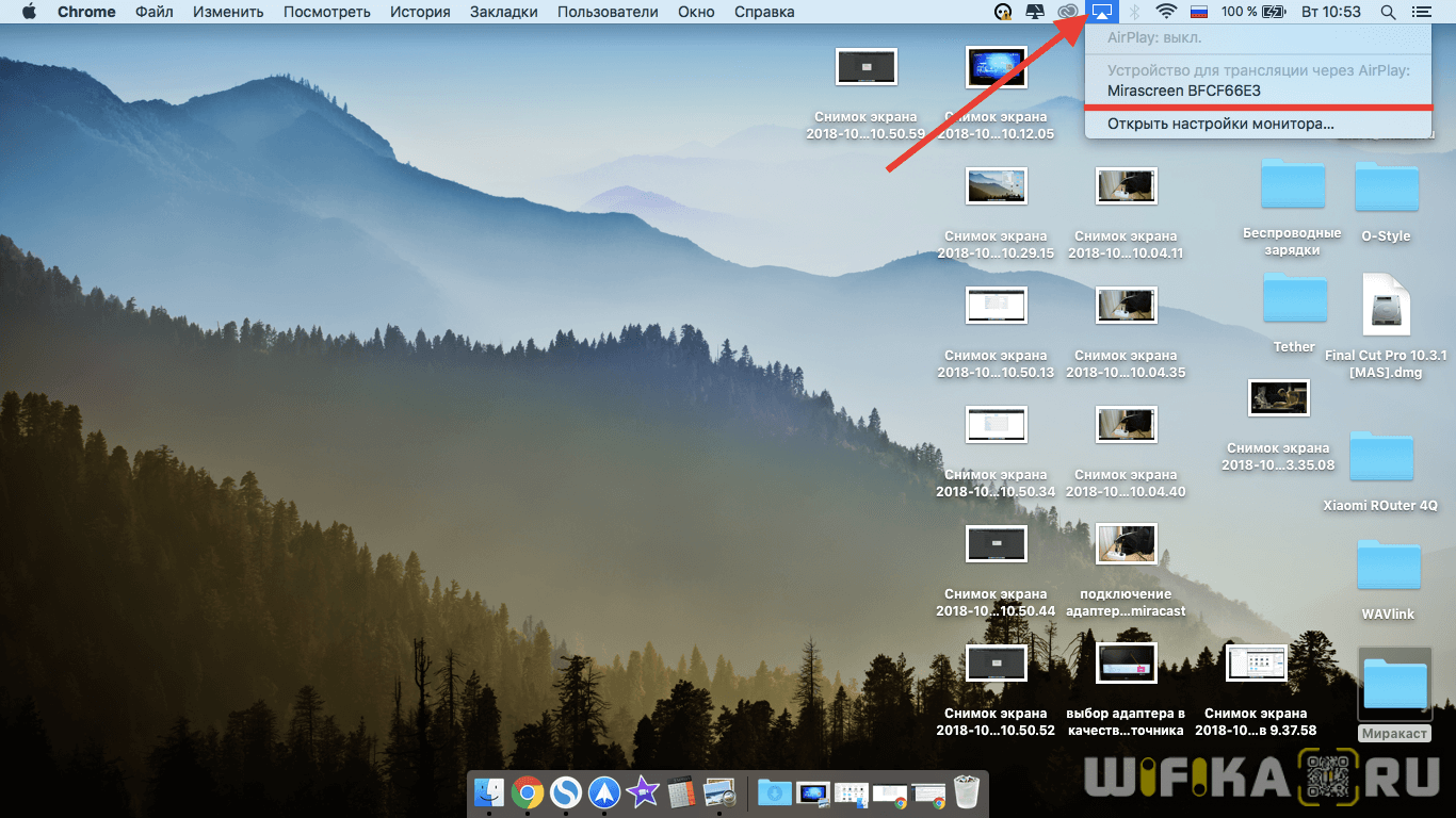 Процесс подключения не сложный. Прежде всего нужно присоединиться к беспроводному сигналу с телевизора. Для этого жмем на иконку wifi и выбираем сеть «MiraScreen»