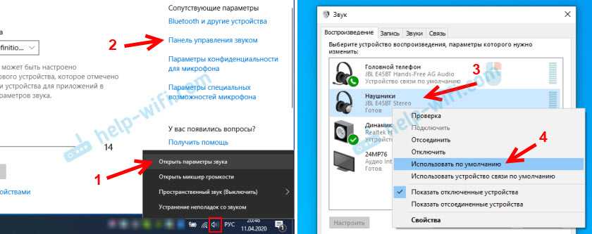 В Windows 10 заходим в Параметры, в раздел «Система», вкладка «Звук» и справа выбираем «Панель управления звуком». Или просто нажимаем правой кнопкой мыши на иконку звука в трее и выберите «Открыть параметры звука», где перейдите в «Панель управления звуком». В окне «Звук», на вкладке «Воспроизведение» должны быть Блютуз наушники. Нужно нажать на них правой кнопкой мыши и выбрать «Использовать по умолчанию».