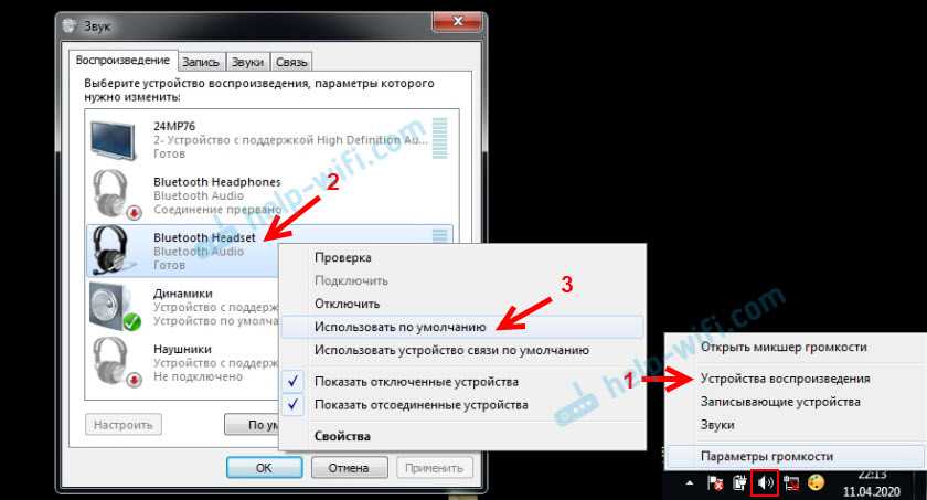 В Windows 7 все примерно так же. Нужно открыть «Устройства воспроизведения» и сделать наушники (Bluetooth Headset) устройством по умолчанию.
