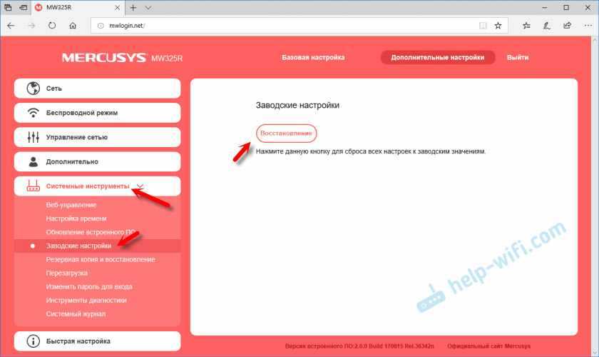 Или через веб-интерфейс в разделе ‘Системные инструменты’ – ‘Заводские настройки’.