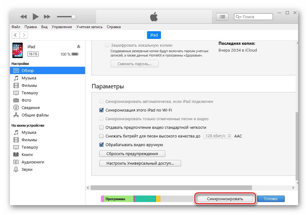 Перейдите в раздел «Обзор», найдите пункт «Параметры» и поставьте галочку напротив «Синхронизация этого iPad по Wi-Fi». Кликните «Применить».